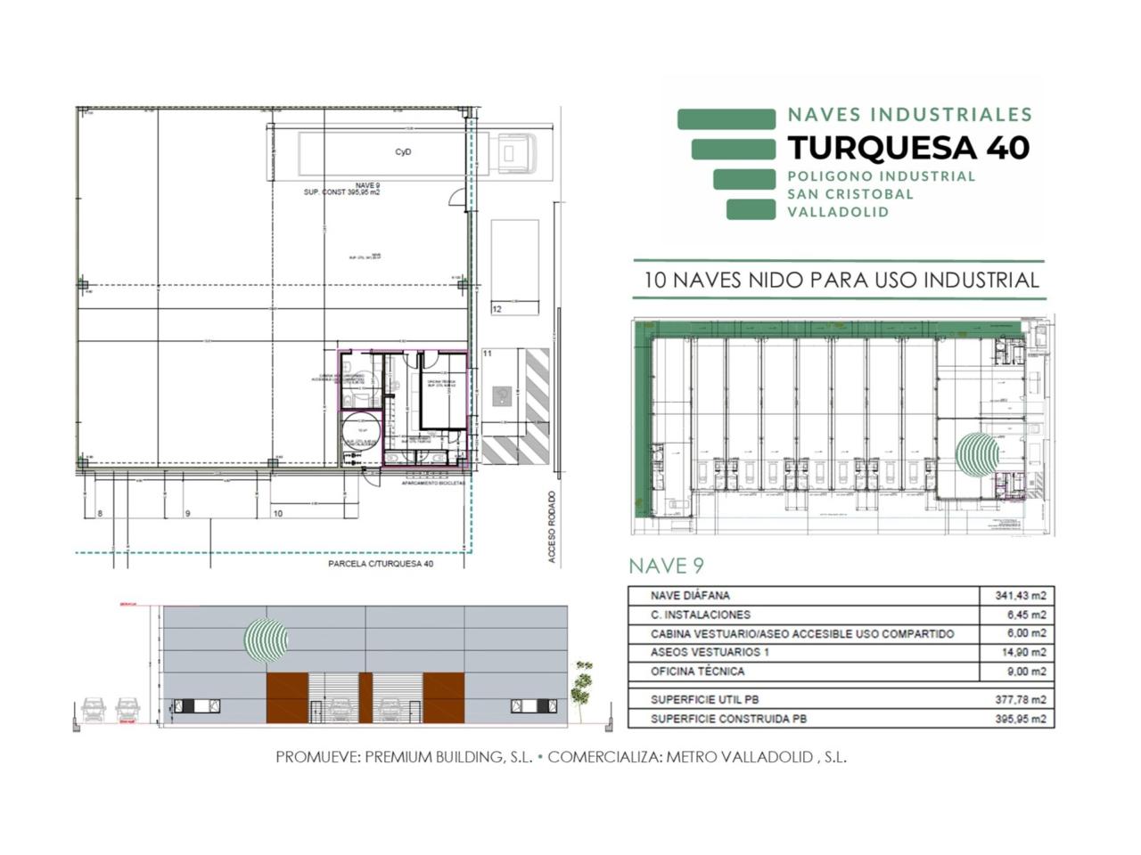 La nave 9 cuenta con un superficie construida aproximada es de 395.95 m², distribuida de forma funcional en Zona principal de nave / almacén: 341.43 m², Zona de oficinas, vestuario, aseo e instalaciones: 36.35 m².